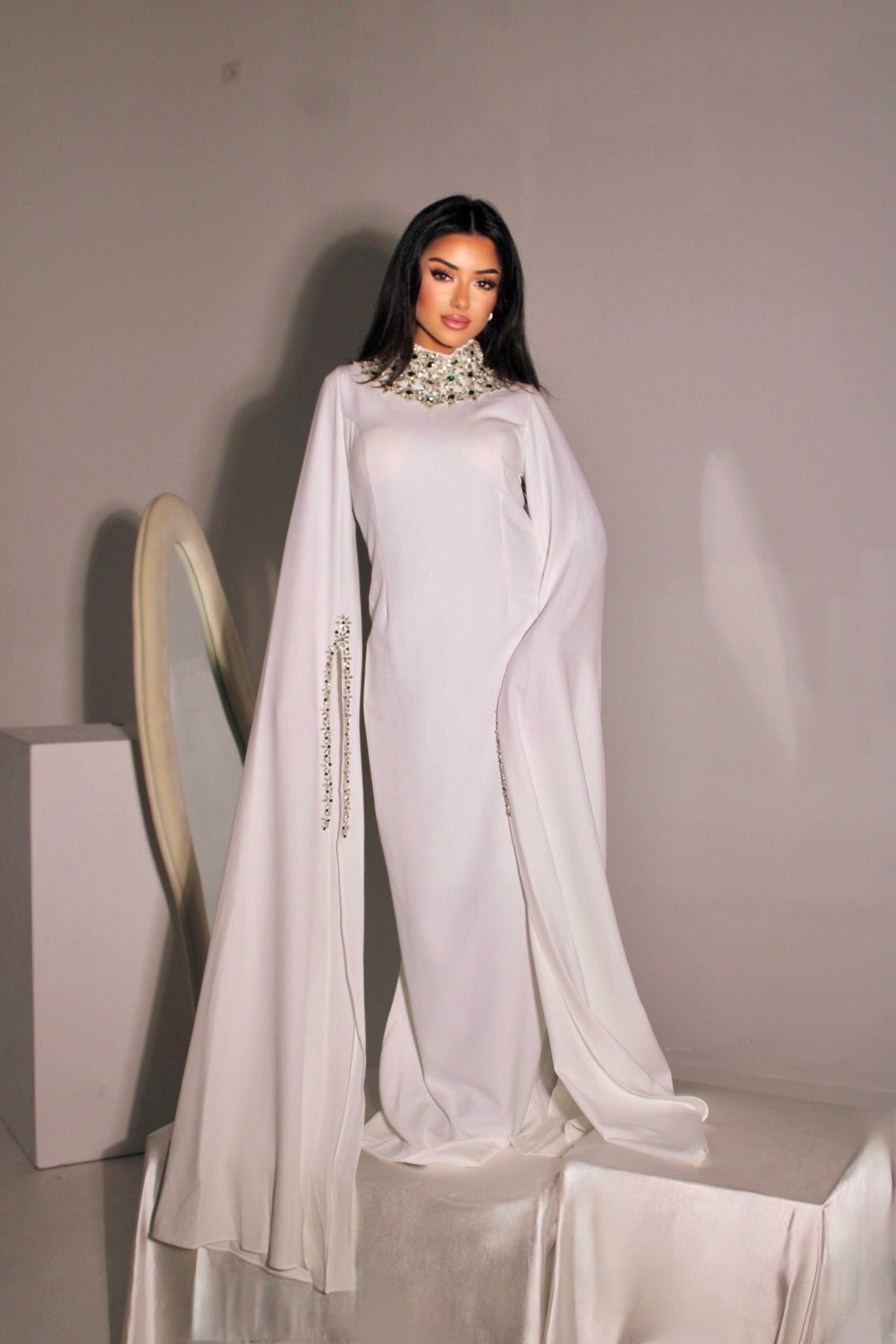 Le modèle AMANI adopte une coupe sirène, mettant en valeur la silhouette avec grâce et sophistication. Il se distingue par ses ornements en perlage émeraude qui illuminent délicatement le cou et les manches, ajoutant une touche précieuse et unique à l’ensemble. Cette robe allie allure majestueuse et détails somptueux pour un résultat captivant.