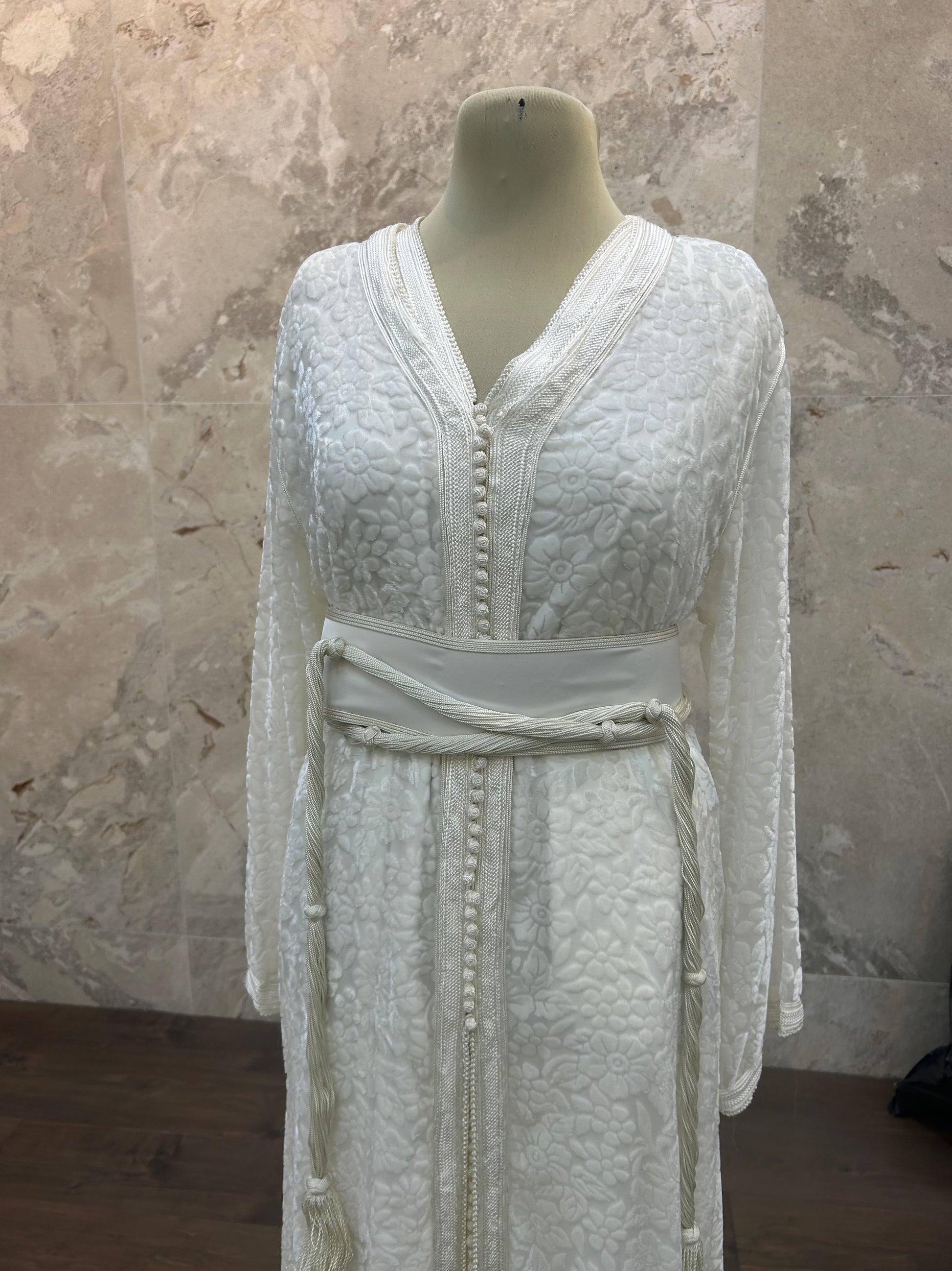 Cette Takchita élégant se décline en deux pièces parfaitement coordonnées, sublimées par un velours raffiné qui apporte une texture riche et sophistiquée. La ceinture à la taille souligne la silhouette avec précision, offrant un ajustement flatteur tout en rehaussant le charme traditionnel de cette tenue. Adaptée tant aux occasions formelles qu’aux événements culturels, cette pièce combine artisanat authentique et confort moderne pour une allure empreinte d’élégance et de distinction.