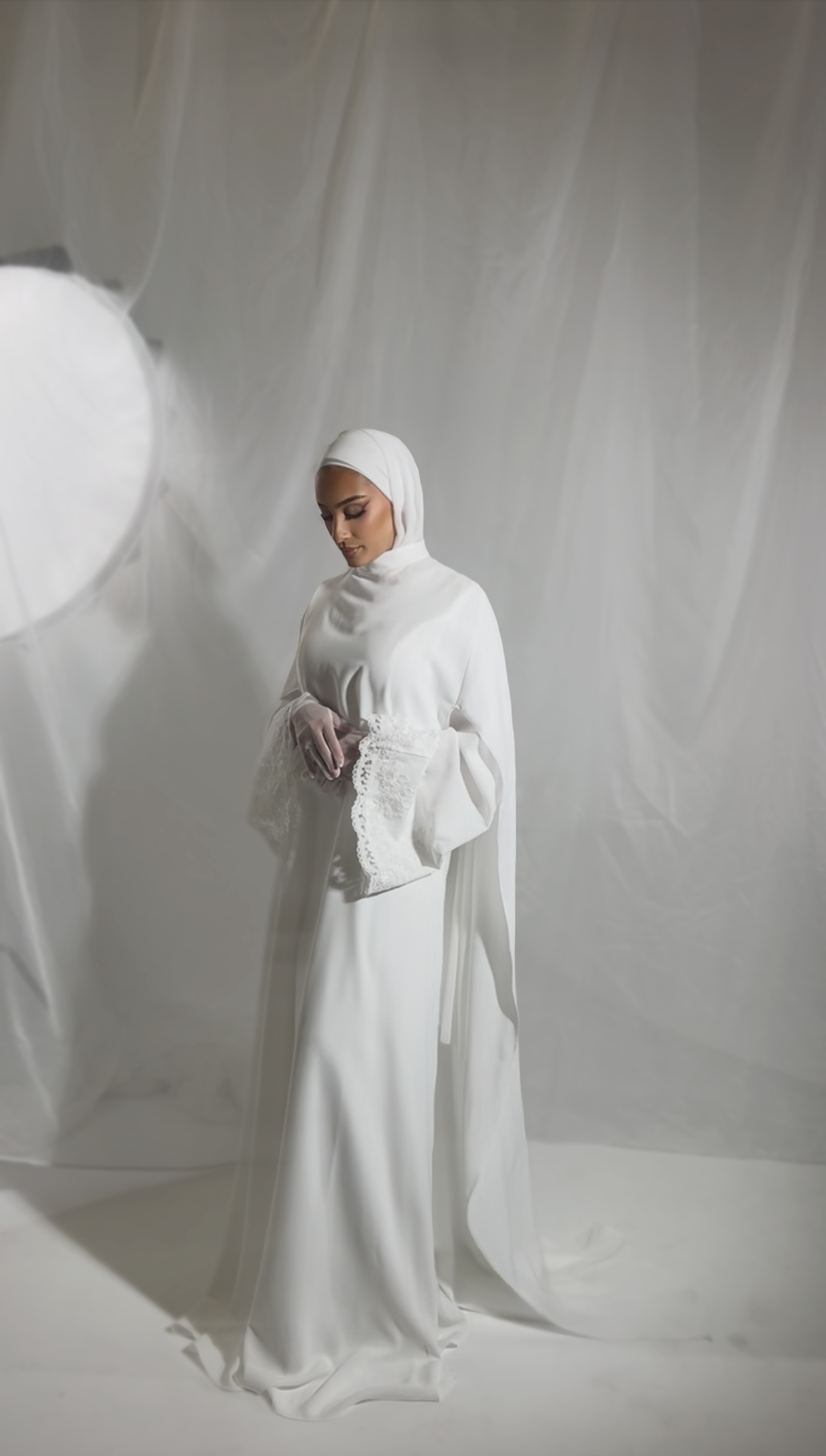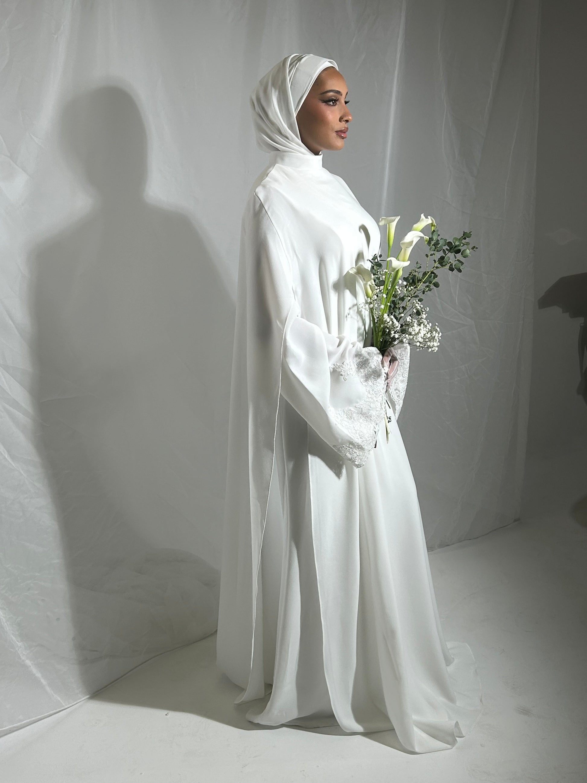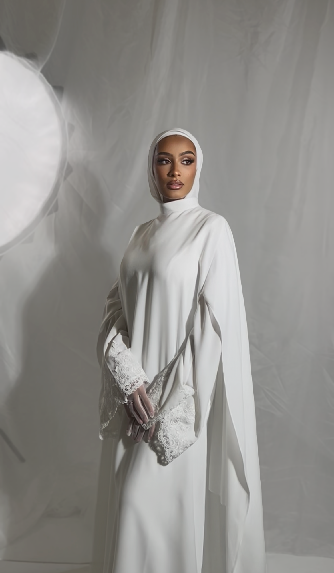 Avec la cape , le rendu devient plus spectaculaire : une aura lumineuse sans dévoiler votre modestie parfaite pour une entrée de cérémonie, des photos mémorables ou un moment fort de la journée. La cape glisse avec finesse sur les épaules et couvre la silhouette tout en captant subtilement la lumière, offrant davantage de pudeur tout en conservant une esthétique luxueuse.