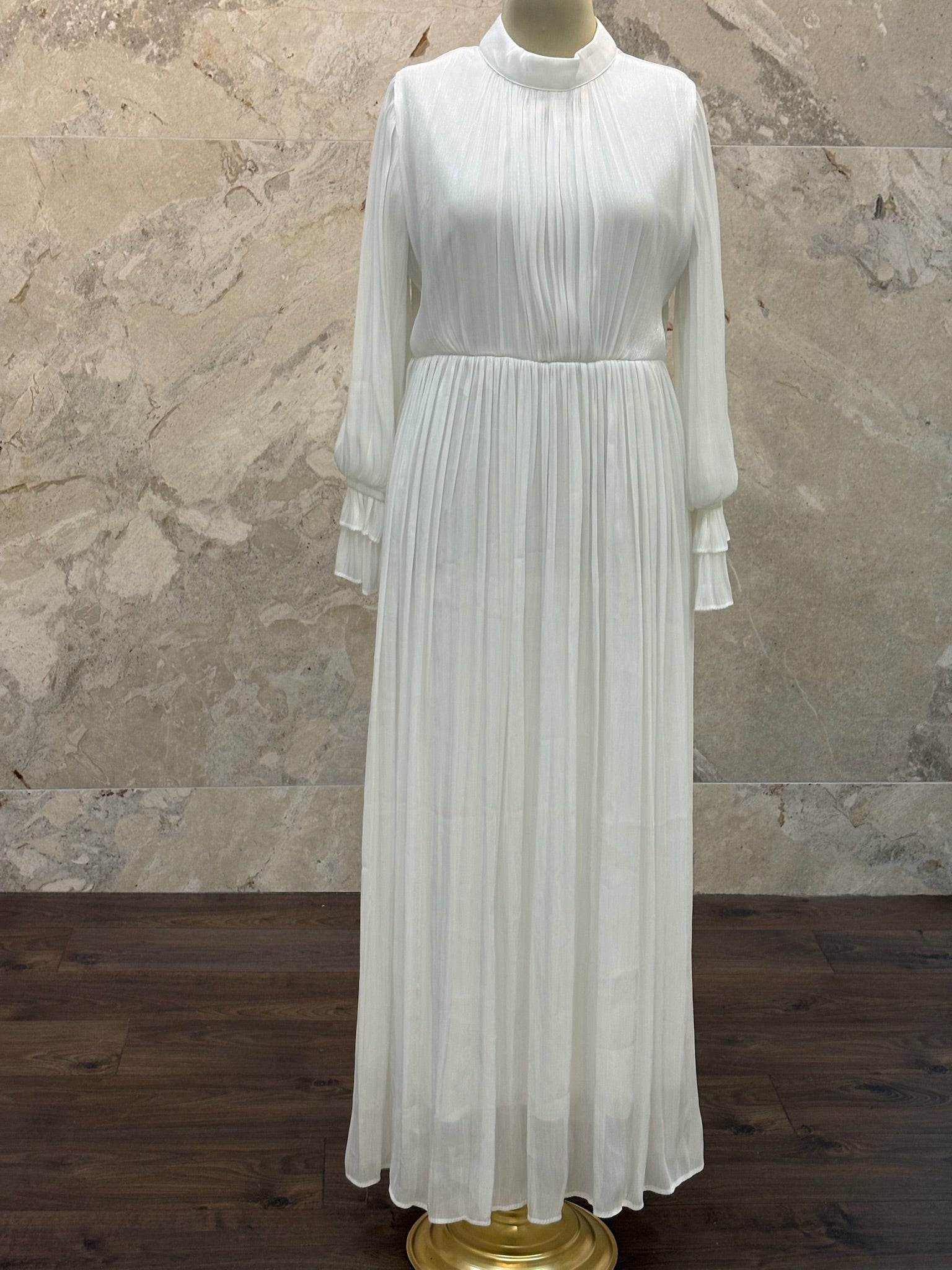 Ce modèle allie simplicité et élégance, parfait pour une première rencontre entre familles ou pour habiller vos demoiselles d’honneur en blanc. Sa coupe entièrement plissée apporte une texture raffinée et fluide, qui met en valeur la silhouette sans alourdir. Les manches, véritable signature du design, ajoutent une touche iconique et sophistiquée, sublimant l’ensemble tout en offrant confort et liberté de mouvement. Conçu avec un souci du détail expert, ce vêtement incarne la délicatesse et le charme indispensables à une occasion aussi spéciale.
