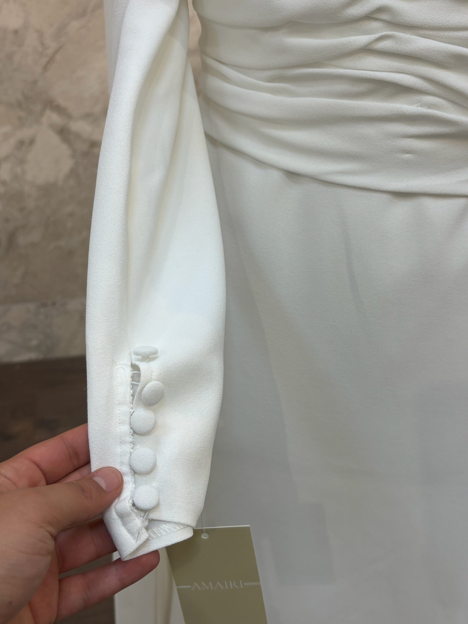 Cette robe de mariée incarne l'élégance discrète avec une coupe cintrée qui souligne délicatement la silhouette tout en préservant une certaine modestie. Son drapé sophistiqué à la taille ajoute du volume et une touche de raffinement tout en mettant en valeur la taille avec subtilité. Conçue pour les mariées recherchant un style à la fois simple et distingué, cette création allie parfaitement confort et esthétique intemporelle.