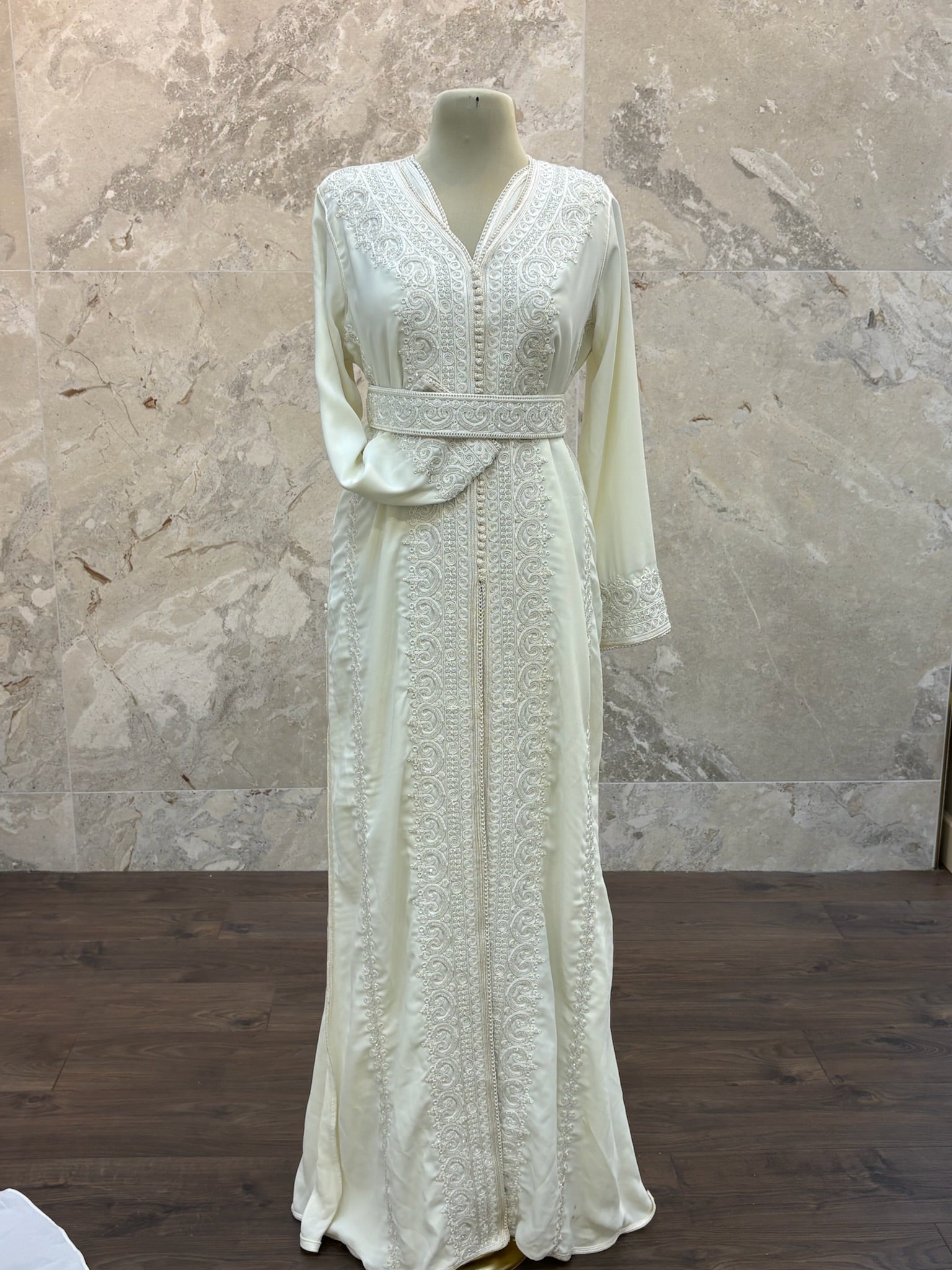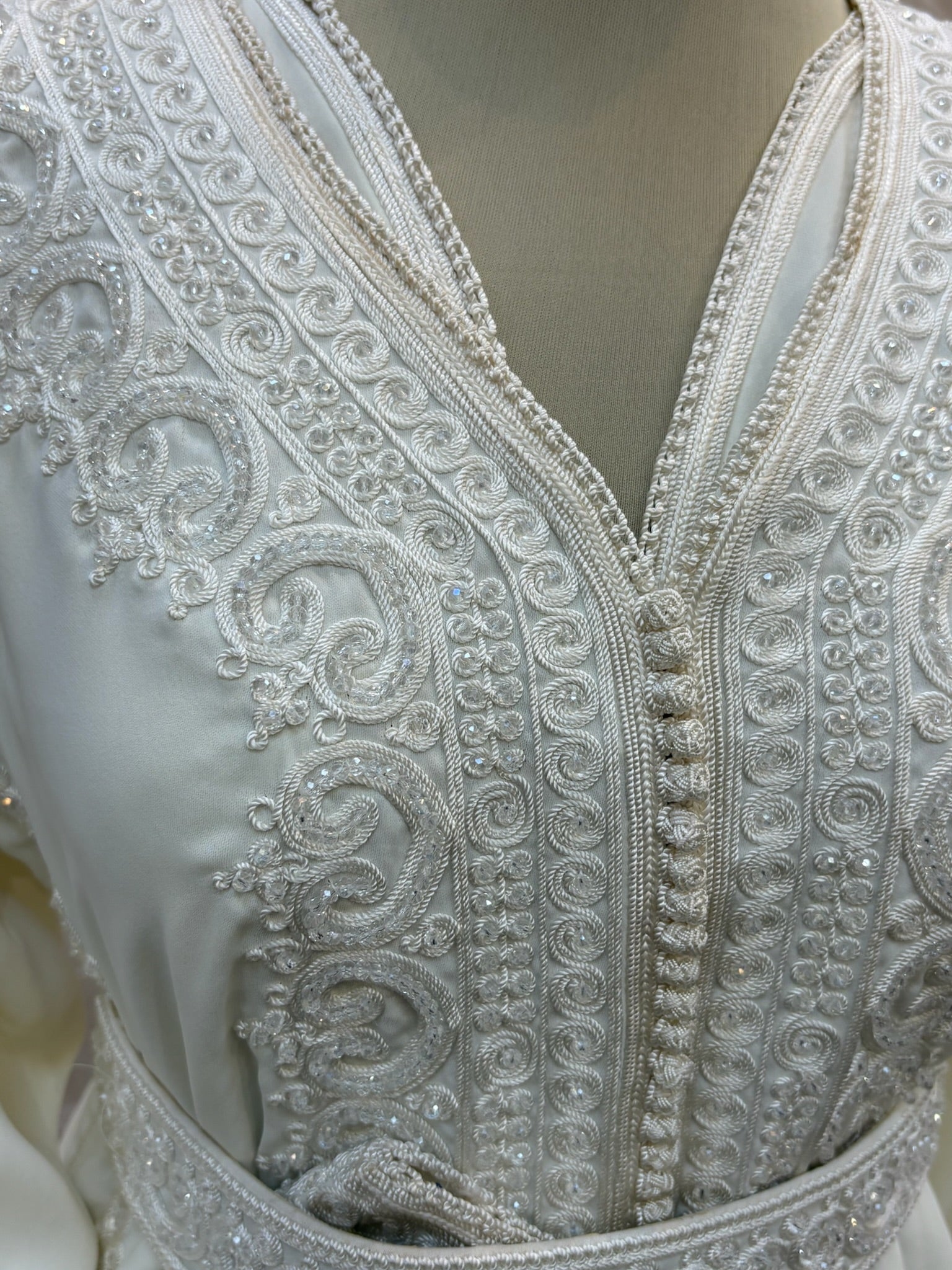 Découvrez notre Takchita 2 pièces, une pièce d’exception travaillée avec soin en tissu crêpe. Chaque détail est sublimé par une broderie délicate et un fin travail de perlage qui apporte éclat et élégance. Ce vêtement raffiné marie tradition et modernité, offrant un tombé fluide et confortable tout en mettant en valeur la silhouette. Parfaite pour les occasions spéciales, cette Takchita incarne le savoir-faire artisanal et la sophistication. Elle vous garantit une allure noble et distinguée, idéale pour briller avec raffinement lors de vos événements les plus précieux